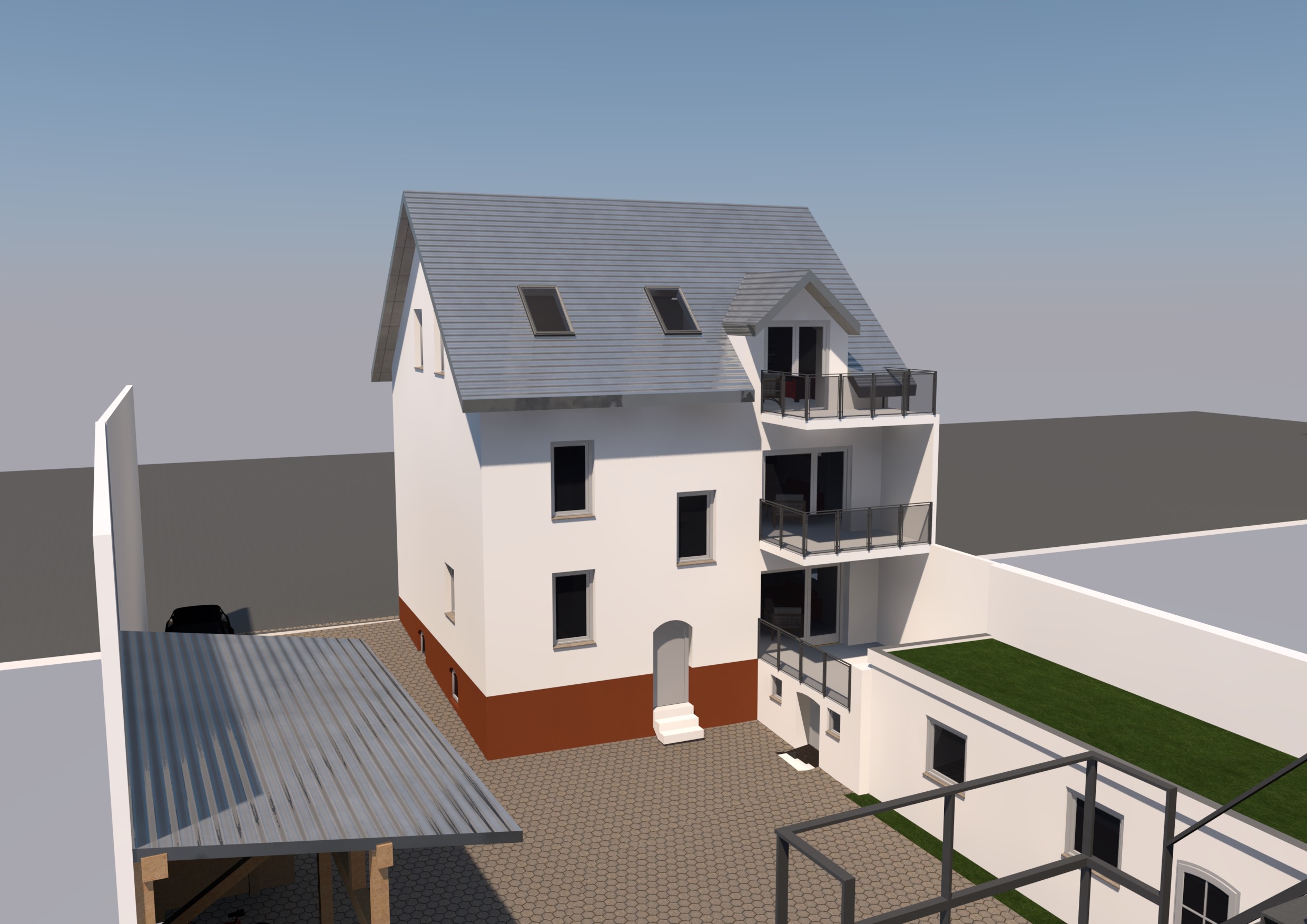- Anbau einer Balkonanlage auf der Gartenseite, Nutzung Flachdach des Nebengebäudes nach Teilabbruch als Terrasse.