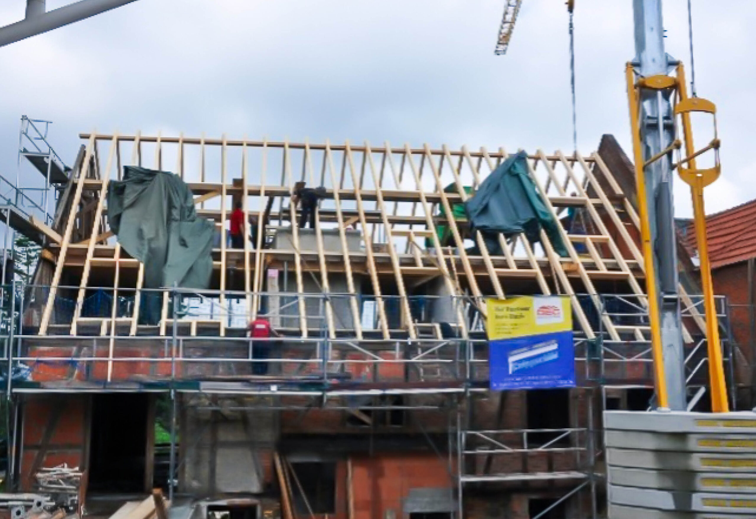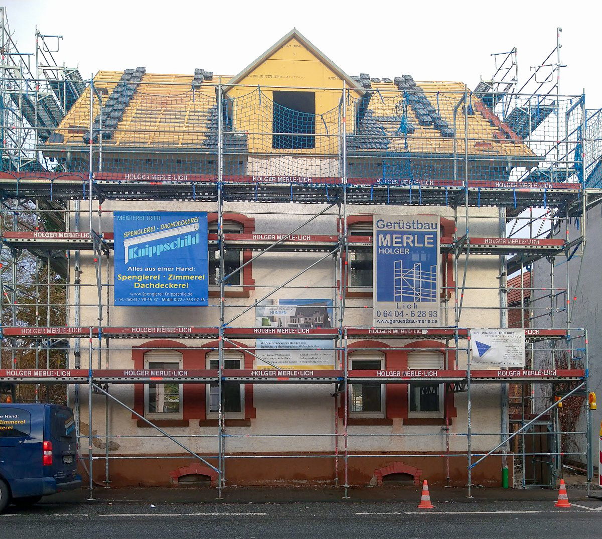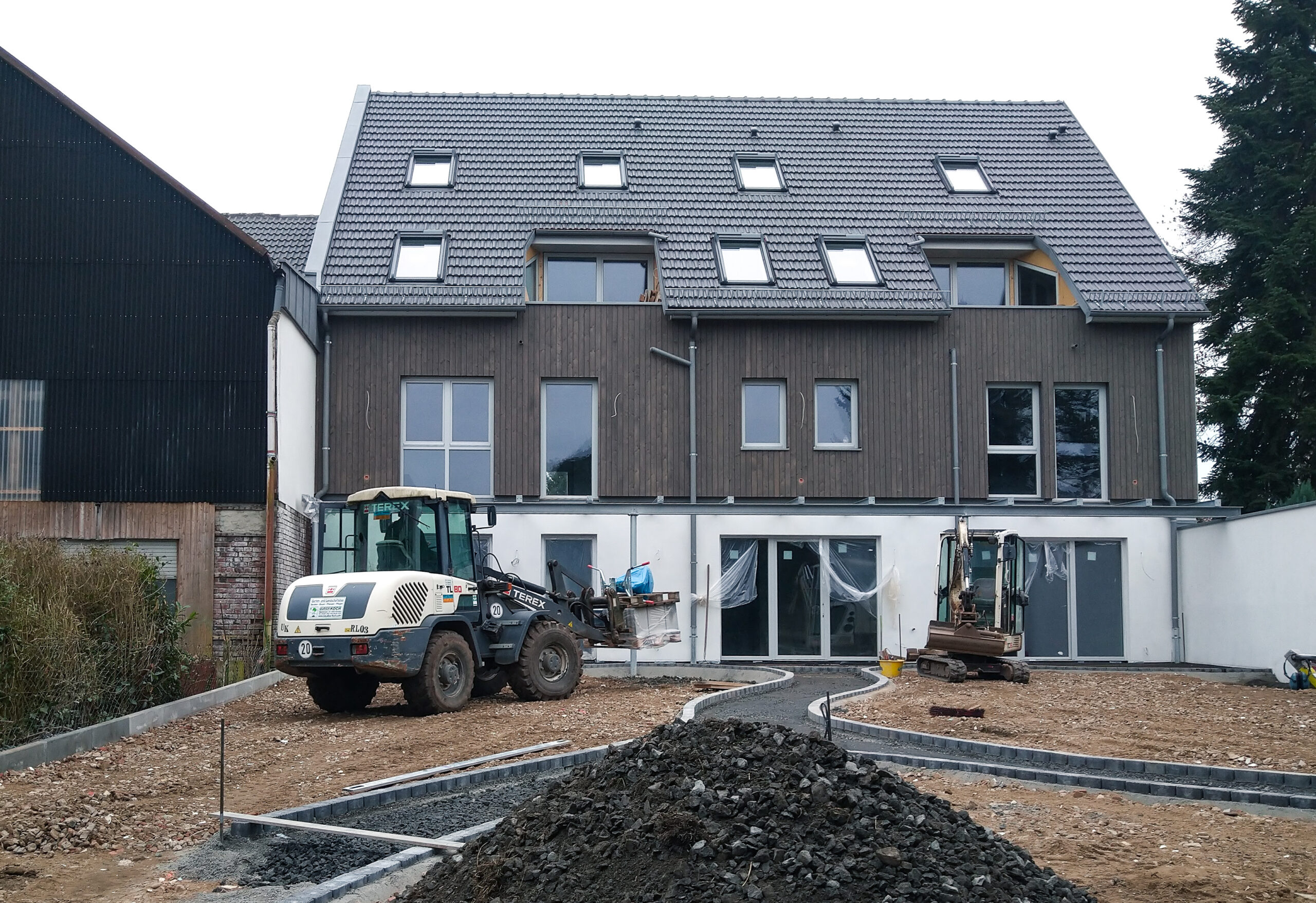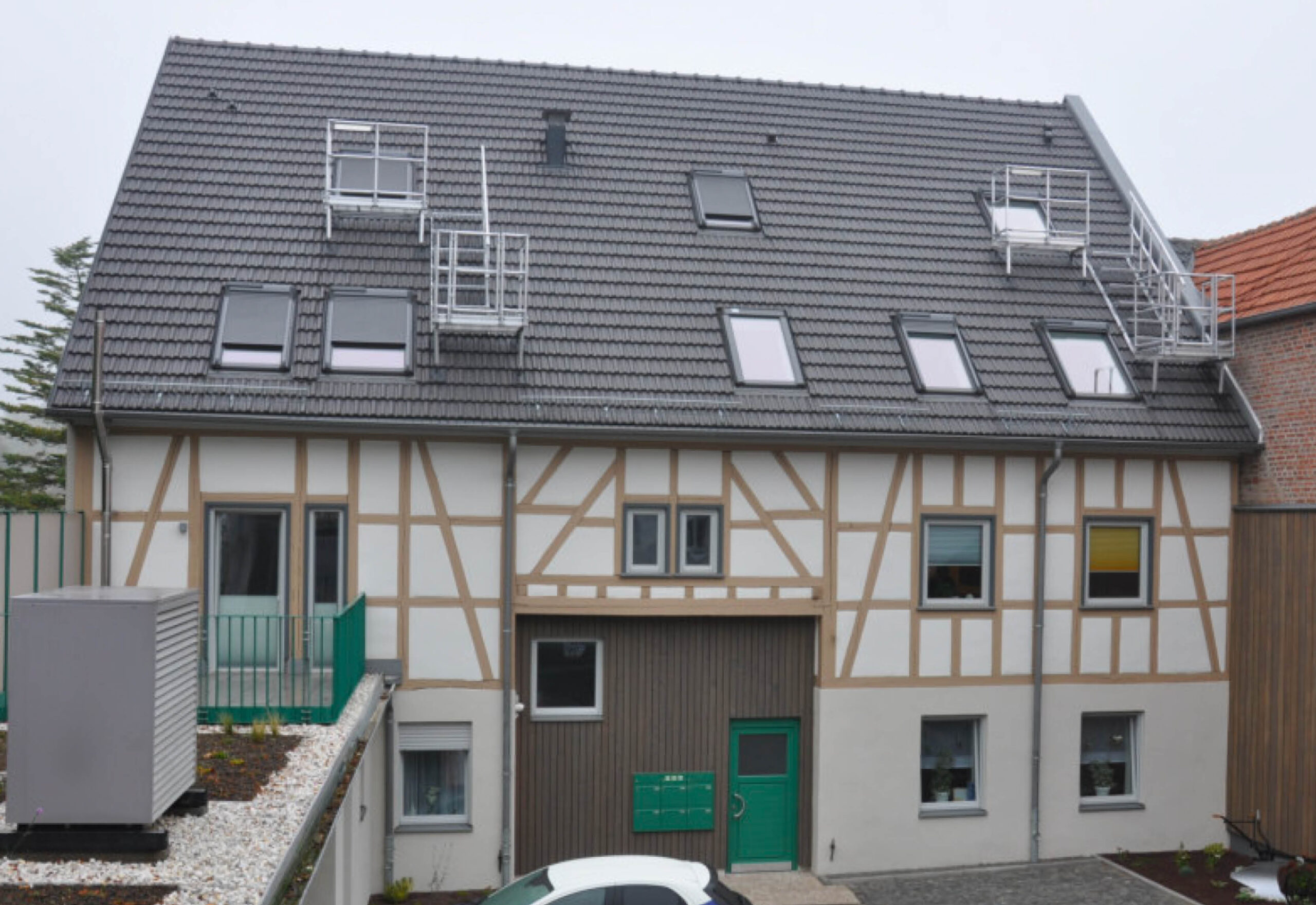 Die Dacheindeckung wurde bei beiden Gebäuden komplett erneuert, wie auch alle Rinnen und Fallrohre. An der Scheune musste der 2. Rettungsweg nach HBO über die Dachfläche geführt werden. Die Wärmeversorgung erfolgt über die Hybridheizung im Seitenflügel mit Fussbodenheizung in der Scheune und Radiatorenheizung im Vorderhaus. Alle Wohnungen wurden mit Netzwerkverkabelung ausgeführt.