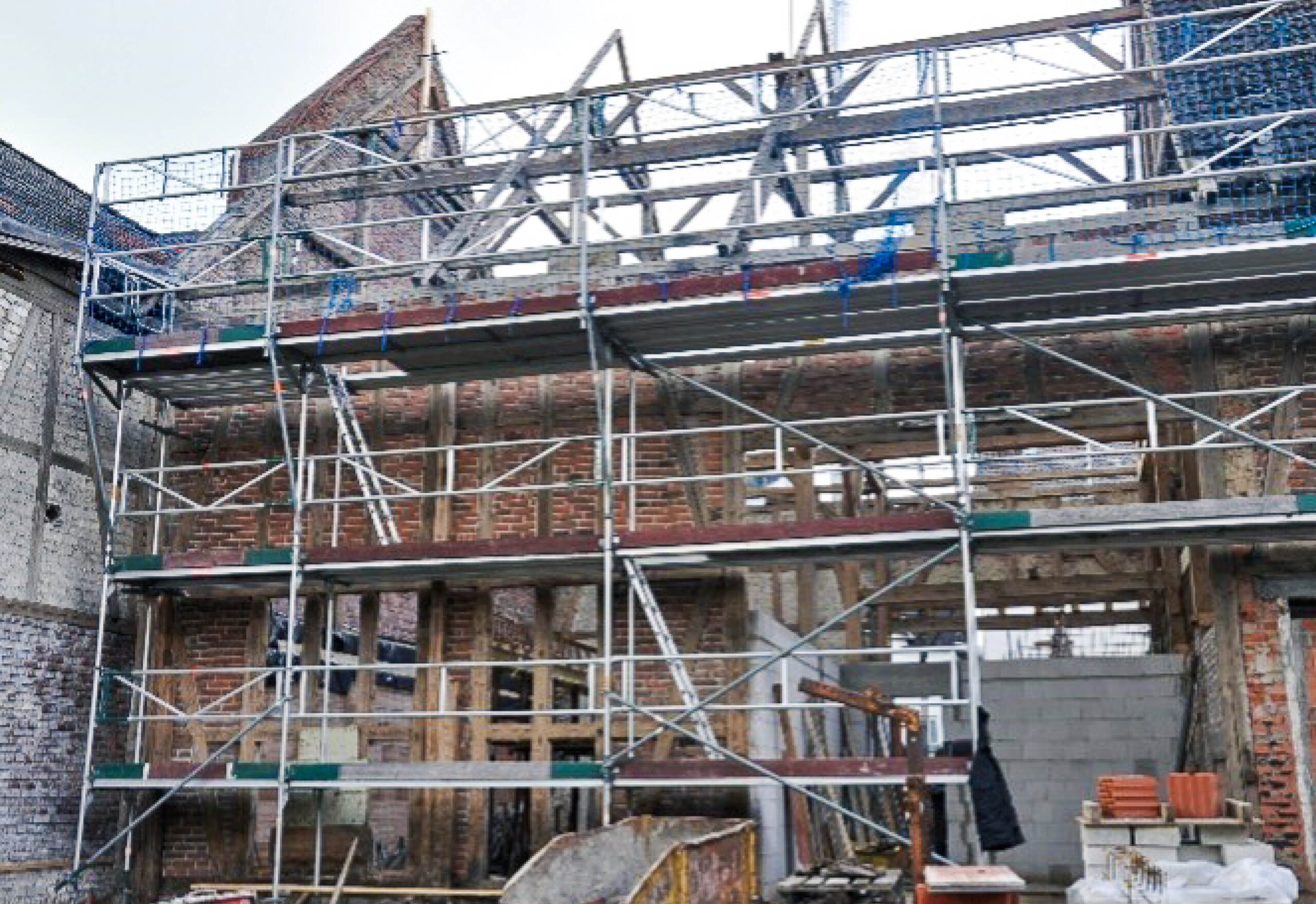 Nach den umfangreichen Abbrucharbeiten wurde zunächst die neue Fundamentierung und Bodenplatte eingebracht, wobei Teile der vorhandenen Bodenplatte mit verwendet wurden. Die tragenden Massivwände und die Massivdecken EG und OG wurden schrittweise so ausgeführt, dass gleichzeitig die tragende Holzkonstruktion der Scheune in diesem Bereich abgebaut werden konnte. Die Kappendecke des Stalls wurde erhalten.