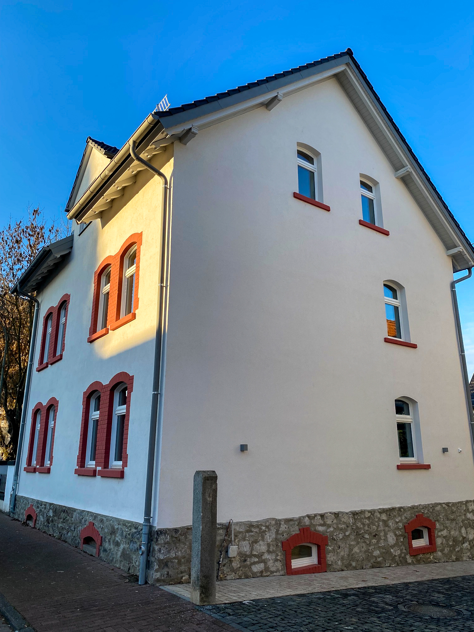 Am Vorderhaus wurde der vorhandene Aussenputz überarbeitet und die gemauerten Laibungen saniert. Das Bruchsteinmauerwerk Sockel wurde freigelegt. Zur Strasse wurde ein Zwerchhaus neu erstellt. Im Dachgeschoss wurde der vorhandene liegende Dachstuhl verstärkt und eine neue Kehlbalkenlage eingezogen, um die Kopfhöhe im Spitzboden zu vergrößern. Eine neue Gaupe auf der Hofseite ermöglicht den Zugang zum Balkon.