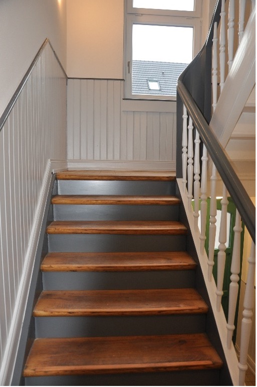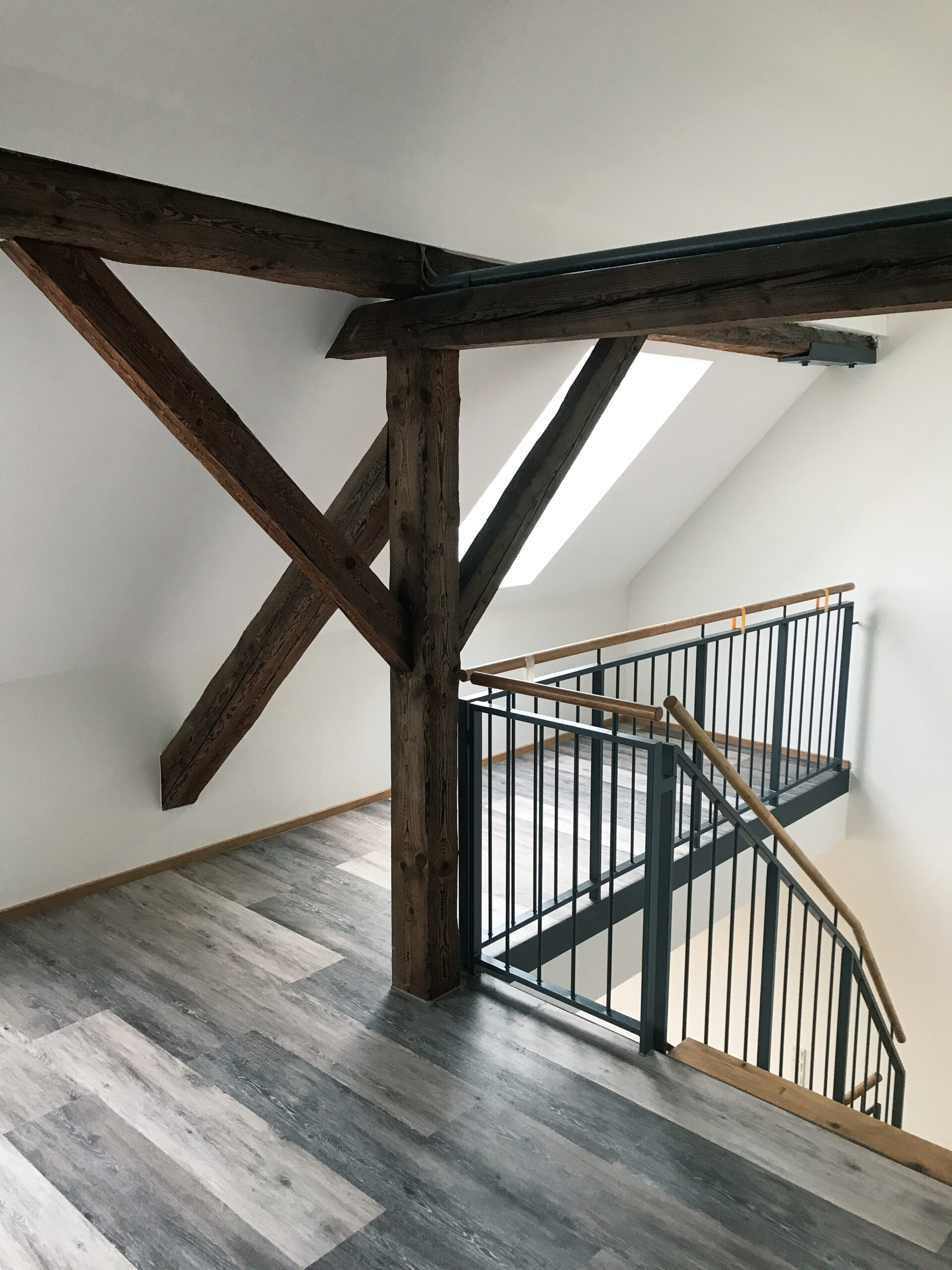 Die Galleriefläche im Spitzboden wird durch eine in den Raum integrierte Spindeltreppe erschlossen. Die vorhandene, mit Linoleum belegte Gebäudetreppe wurde komplett abgeschliffen und überarbeitet, die Holzverschalungen ausgebessert und neu lackiert.